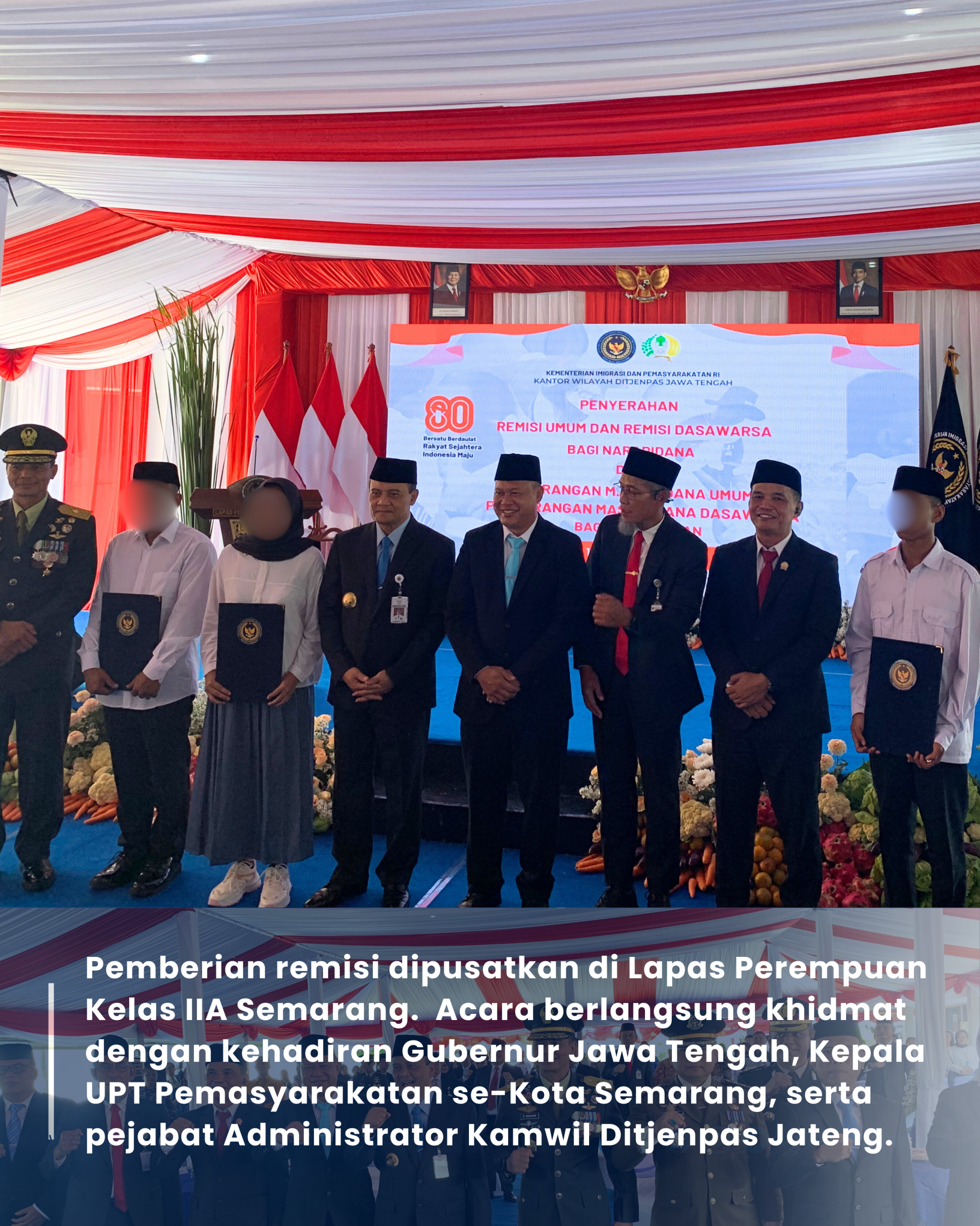 Kakanwil Ditjenpas Jateng, Mardi Santoso, menjelaskan bahwa tahun ini sebanyak 8.737 narapidana dan anak binaan di Jawa Tengah memperoleh Remisi Umum, sementara 9.964 orang mendapatkan Remisi Dasawarsa. Lapas Kelas I Semarang tercatat sebagai penerima terbanyak dengan 794 orang untuk Remisi Umum dan 874 orang untuk Remisi Dasawarsa.