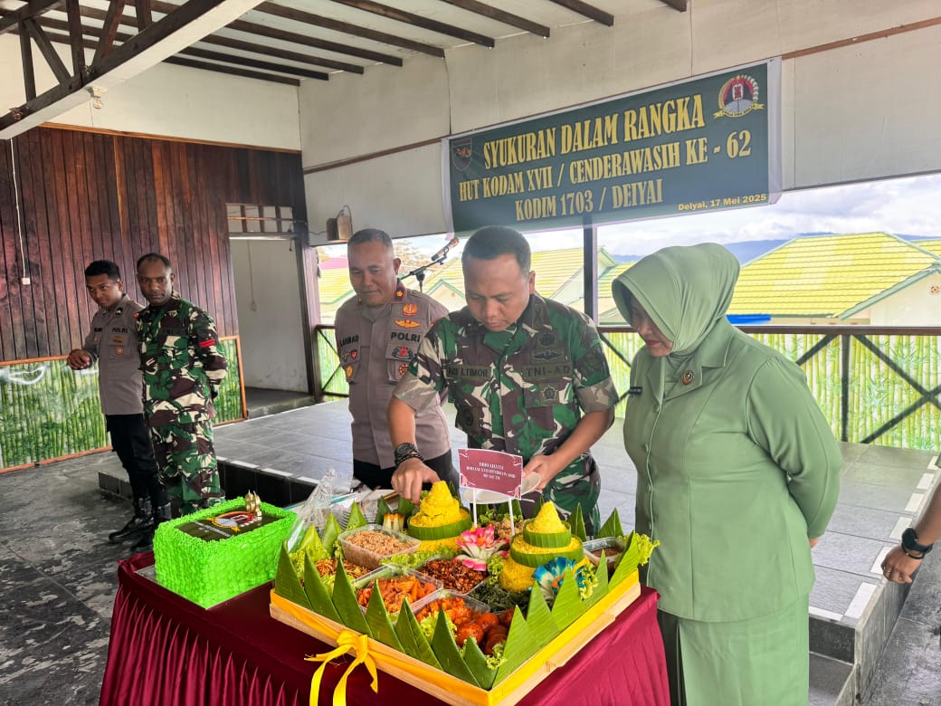 Acara Syukuran dalam rangka HUT Kodam XVII/Cenderawasih ke -62, Kodim 1703/Deiyai, kegiatan dipimpin oleh Letkol Inf Ari Iswoyo Timor, S.Hub., Int. di ikuti oleh kurang lebih 50 orang Yang bertempat di Makodim 1703/Deiyai, Jl. Poros Tigi Doo, Kel. Waghete II, Distrik Tigi, Kab. Deiyai, Prov. Papua Tengah, Sabtu, 17 Mei 2025.