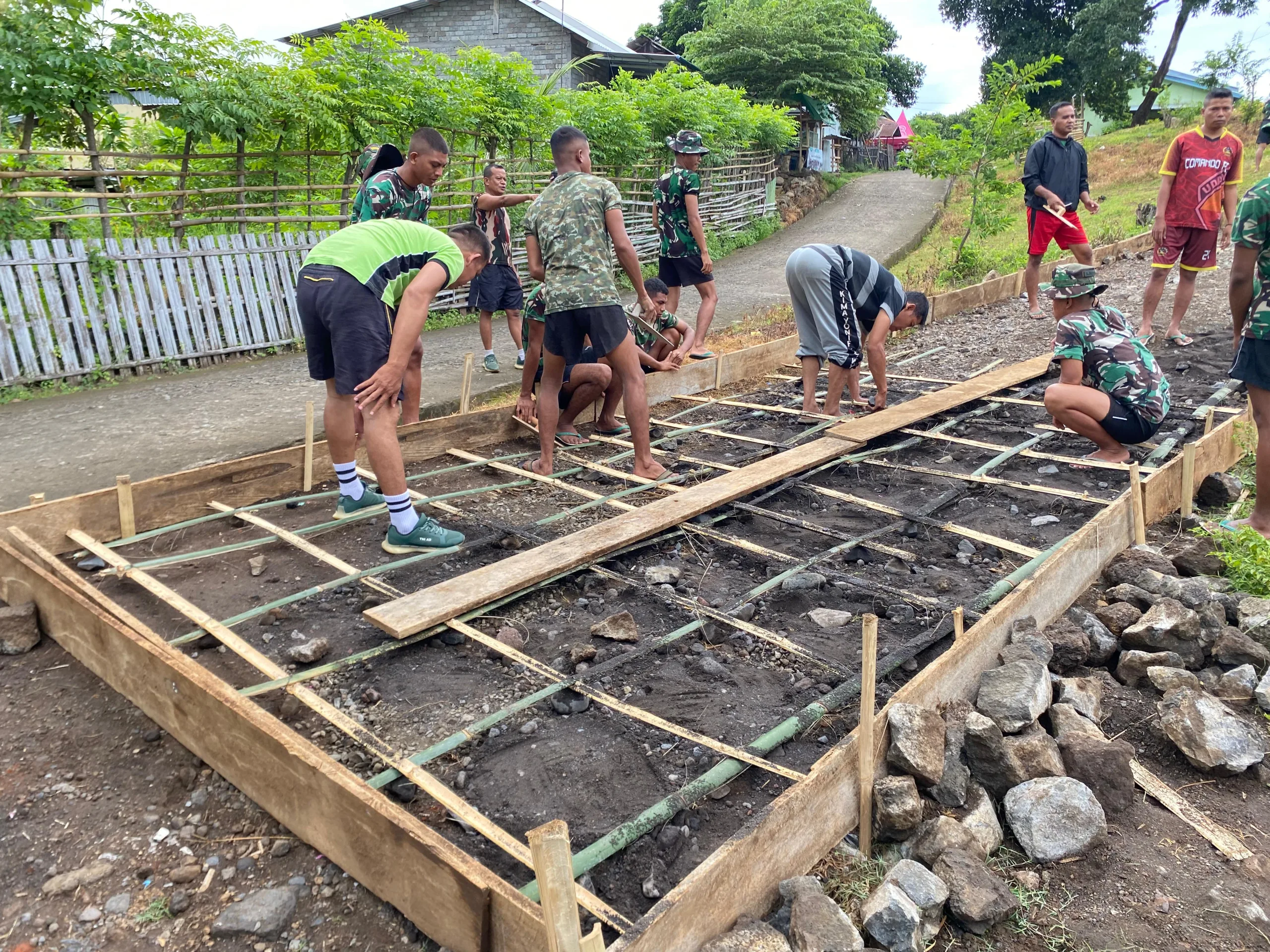 Dengan penuh disiplin dan kekompakan, para prajurit bahu-membahu mengaduk material cor, mengatur aliran air, menata kerangka jalan, serta melakukan pengecoran secara merata. Cuaca yang Yang mendung semakin mendukung kelancaran pekerjaan, sehingga seluruh personel dapat bekerja maksimal sesuai pembagian tugas masing-masing.