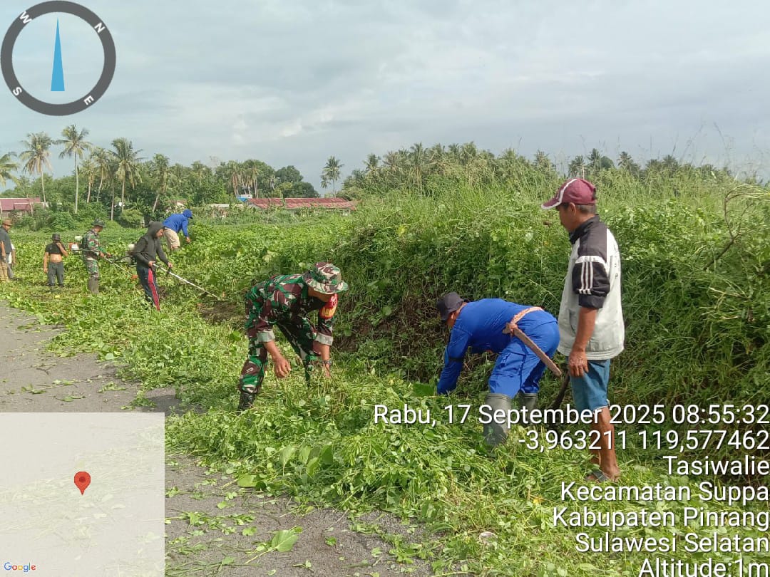 Pinrang_ Untk menjaga kebersihan Lingkungan, Koramil-01/Suppa Kodim 1404/Pinrang menggelar kerja bakti bersama warga dengan sasaran pembersihan pembersihan saluran air di Desa Tassiwalie Kecamatan Suppa Kabupaten Pinrang, Rabu (17/09/2025).