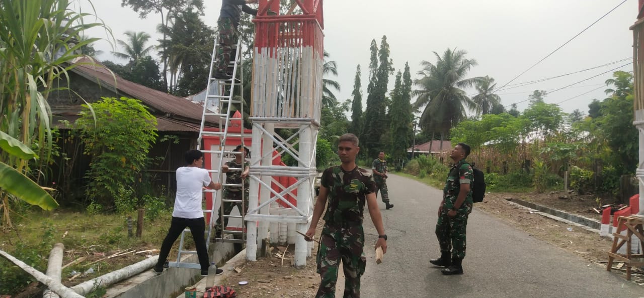 Anggota Koramil 01/Pariaman Melaksanakan Goro Melanjutkan Perbaikan Gapura dan Poskamling Di Kampung Pancasila Bersama Masyarakat Desa Marunggi