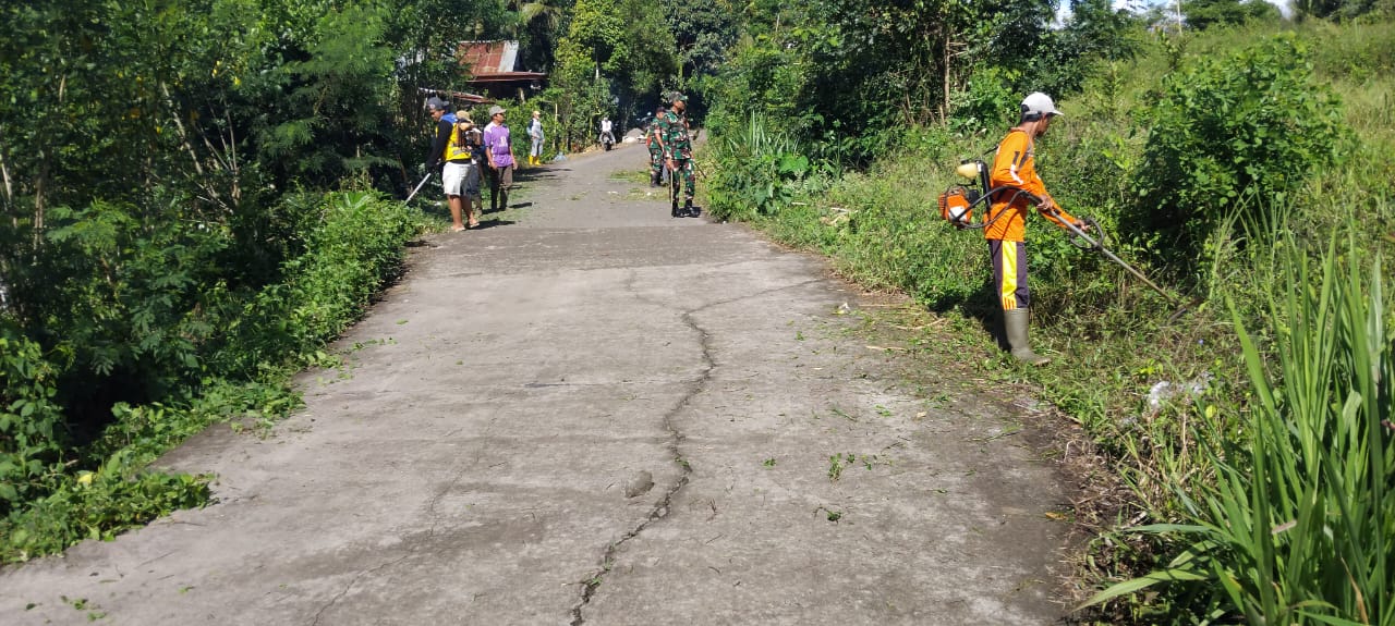 Tampak anggota Koramil bersama masyarakat bersemangat membersihkan sampah dan rumput-rumput liar di selokan, untuk kemudian dibuang ke tempat sampah yang tersedia.
