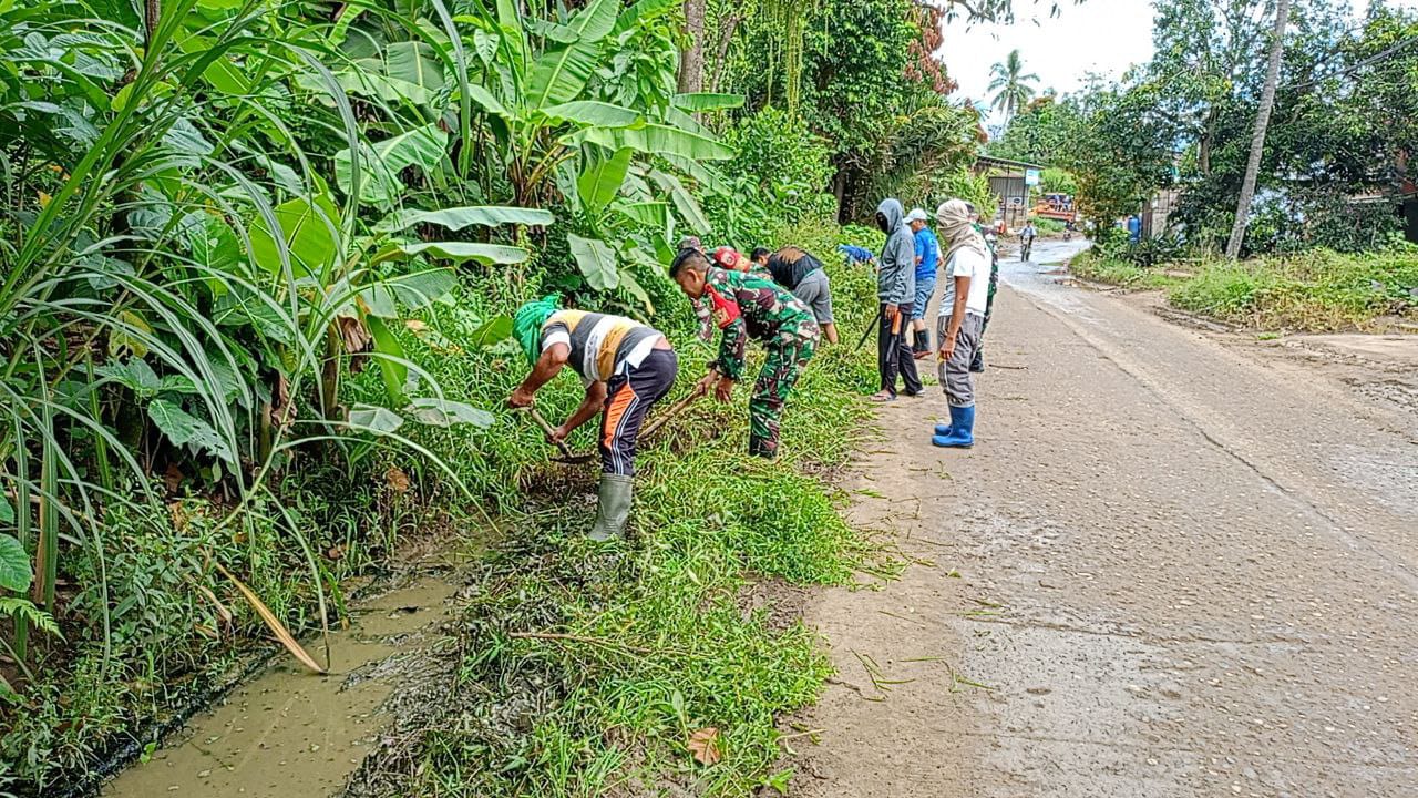 Tampak anggota Koramil bersama masyarakat bersemangat membersihkan sampah dan rumput-rumput liar di selokan, untuk kemudian dibuang ke tempat sampah yang tersedia.