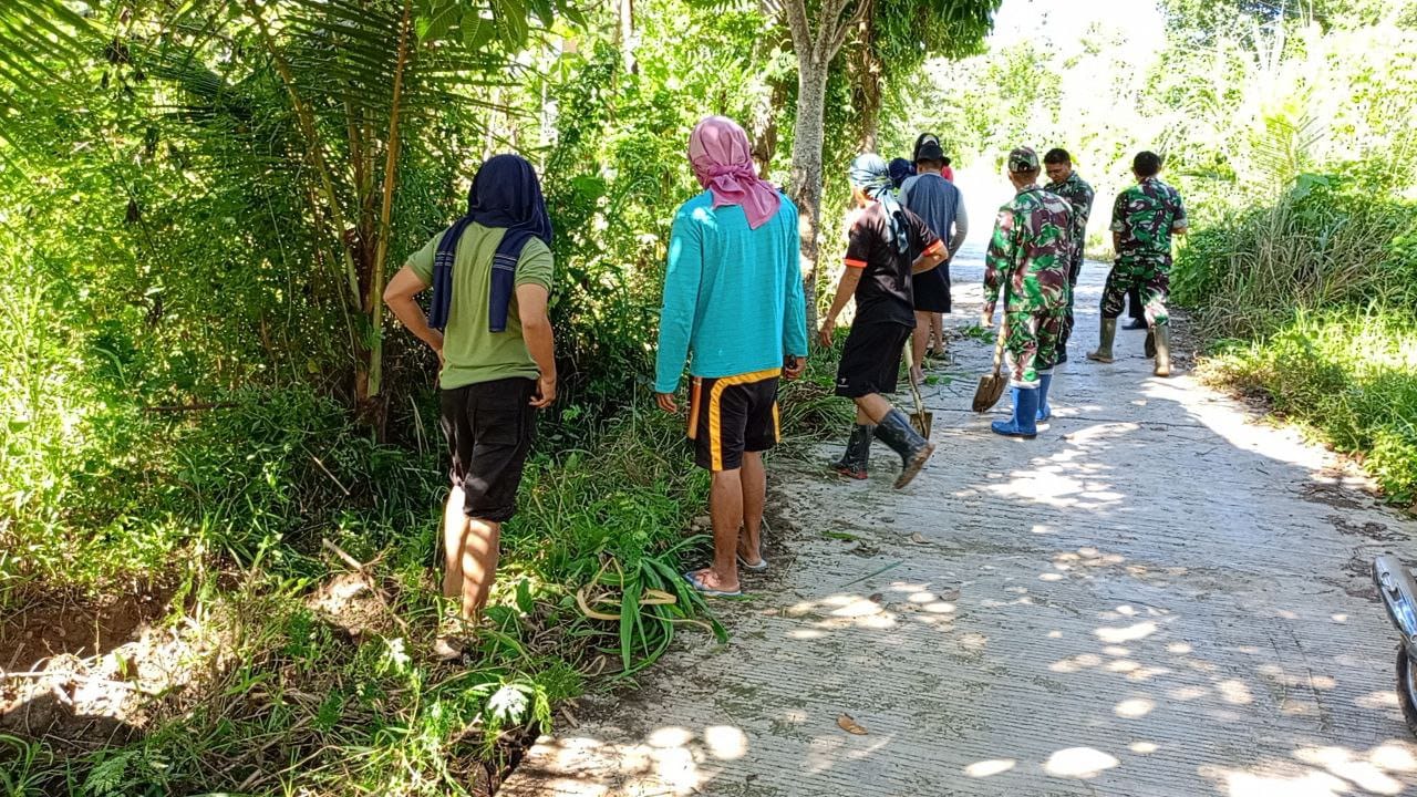Enrekang _ Anggota Koramil 03/Baraka Kodim 1419/Enrekang dan masyarakat sekitar terlihat bersama -sama Melaksanakan karya bakti pembersihan selokan dari tanah, rumput dan sampah lainnya sepanjang 150 meter di Dusun Batu Bulan Desa Tirowali Kec. Baraka Kab. Enrekang, Minggu (25/05/2025).