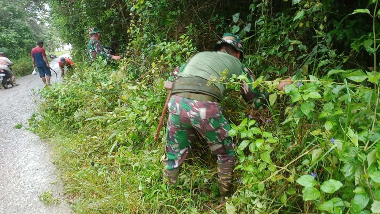 Pada kesempatan tersebut Pelda Yudin Djoni melaksanakan gotong-royong bersama masyarakat membersihkan sampah dan rumput liar di pinggir badan jalan di wilayah binaan tersebut, kondisi tersebut mendorong Babinsa mengajak masyarakat untuk bergotong royong guna melaksanakan pembersihan rumput dan sampah sehingga nantinya membuat kondisi jalan menjadi kelihatan bersih dan terpelihara.