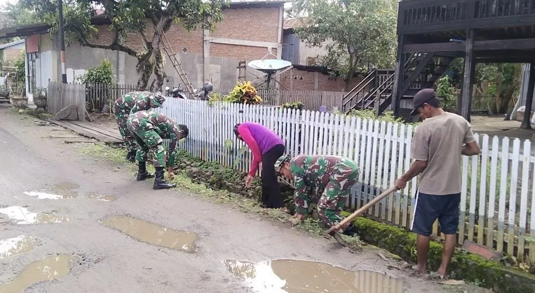 Anggota Koramil bersama warga bahu-membahu membersihkan sampah dan endapan lumpur yang menyumbat saluran air di lingkungan pemukiman. Kerja bakti ini juga bertujuan untuk menumbuhkan kesadaran masyarakat akan pentingnya menjaga kebersihan lingkungan secara berkelanjutan.