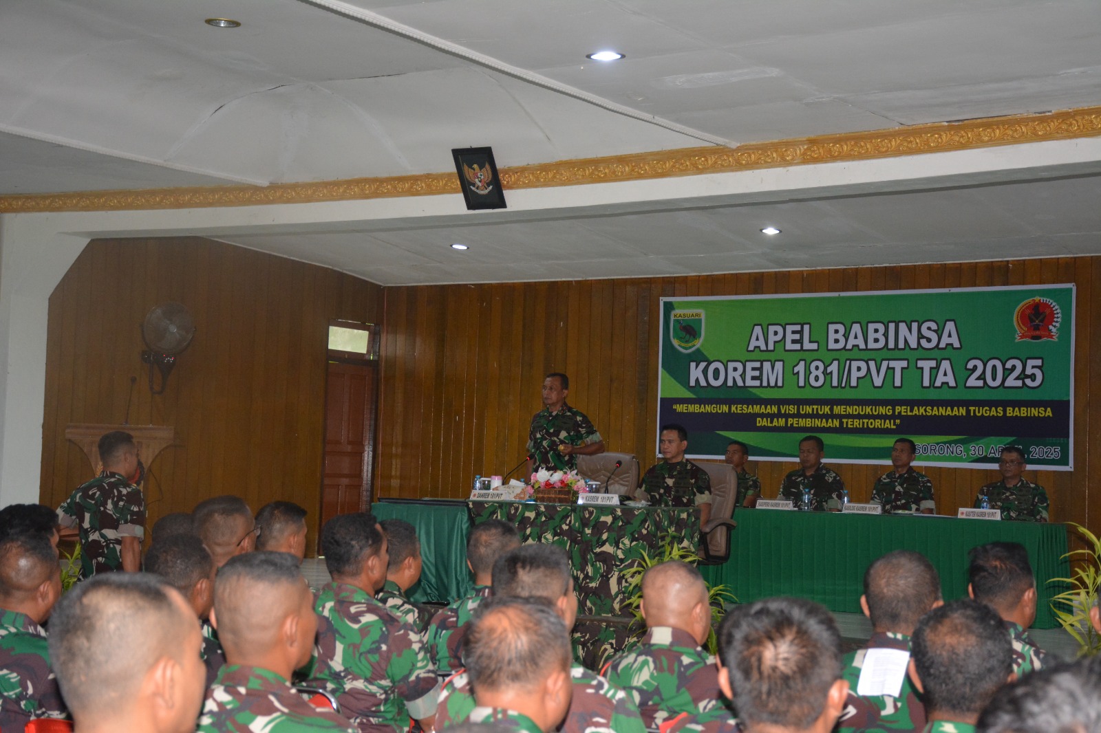 Sorong – Papua Barat Daya, Korem 181/Praja Vira Tama (PVT) menggelar Apel Babinsa yang bertajuk “Membangun Kesamaan Visi untuk Mendukung Pelaksanaan Tugas Babinsa dalam Pembinaan Teritorial” bertempat di Aula Praja Vira Tama, Jalan Pramuka No. 1, Distrik Malaisimsa, Kota Sorong, Papua Barat Daya, Rabu (30/4/2025).