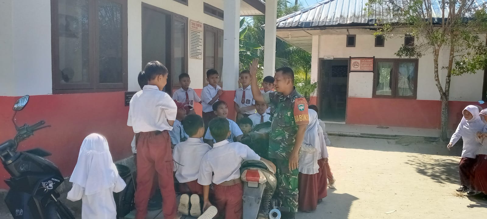 Babinsa Koramil 02/Simeulue Tengah Kodim 0115/Simeulue Sertu Rahimuddin memberikan edukasi wawasan kebangsaan melalui komunikasi sosial (komsos) dengan siswa-siswi SD Negeri 1 Simeulue Tengah. (03/06/2025).