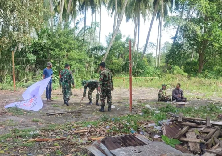 Babinsa Posramil Tadu Raya Kodim 0116/Nara, Kopda Zulhadi bersama Danposramil Tadu Raya dan babinsa lainnya dan bersama warga melaksanakan gotong- royong pembersihan lahan KDKMP di Desa Kuala Tadu Kec. Tadu Raya Kab. Nagan Raya Jumat(07/11/2025).