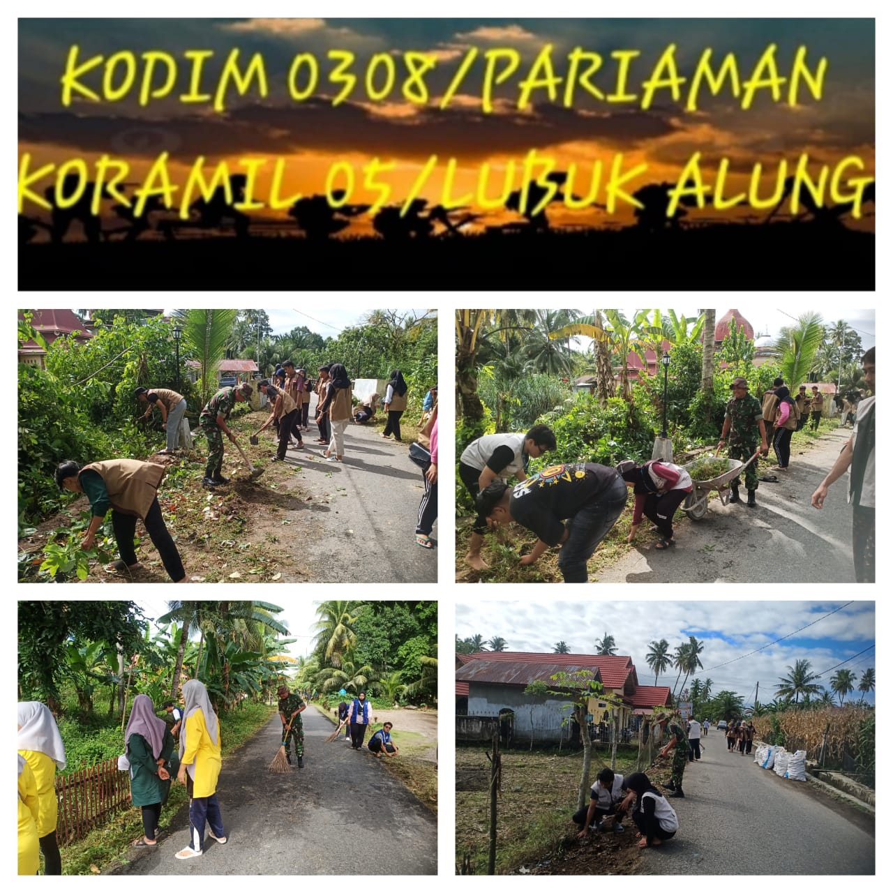 LUBUK ALUNG, – Babinsa Koramil 05/Lubuk Alung Kodim 0308/Pariaman Serka Pauzi Adri melaksanakan gotong royong bersama masyarakat, jajaran instasi Kecamatan di nagari toboh gadang selatan Kecamatan Sintuak Toboh Gadang, Kabupaten Padang Pariaman, Rabu (09/07/2025).