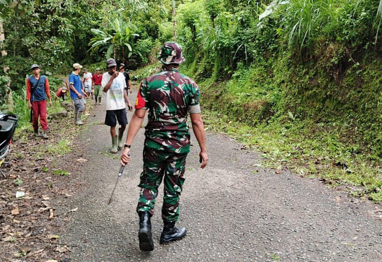 Sinjai. Babinsa Desa Saotanre Koramil 1424-03/Sinjai Tengah, Kopda Supriadi, bersama Kepala Dusun dan masyarakat, melaksanakan kerja bakti dengan sasaran pembersihan jalan dan drainase dari material tanah dan sampah.(31/07/2025)