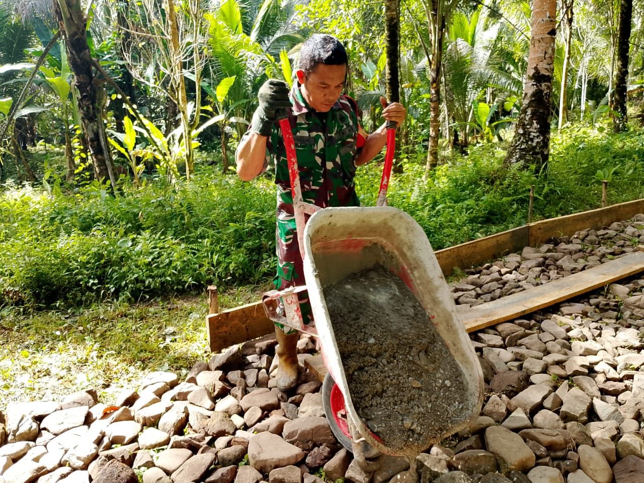 Babinsa DESA Administrasi NAYET Serka J. M.SITANGGANG membantu pembuatan jalan Setapak dgn PANJANG KURANG LEBIH 250 M dan LEBAR 2,10cm yang menghubungkan DESA NAYET dan Kebun KELAPA Masyarakat yang berada di belakang kampung DESA NAYET Kec Siwalalat Kab Seram Bagian Timur. Senin (28/04/2025).