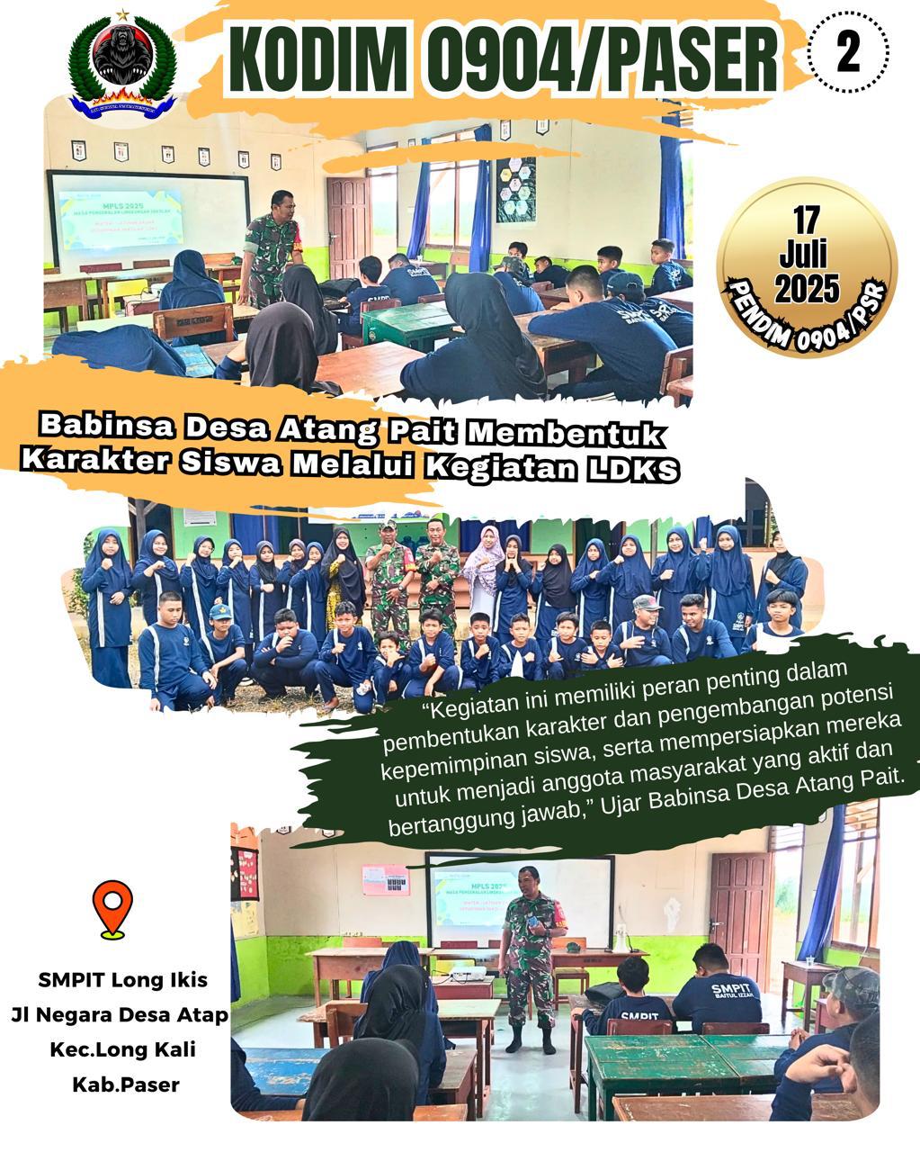 Kodim 0904/Psr, Korem 091/ASN, Kodam VI/Mlw – Babinsa Desa Atang Pait Serka Joko Purnomo melaksanakan Latihan Dasar Kepemimpinan Sekolah (LDKS) pada rangkaian kegiatan Masa Pengenalan Lingkungan Sekolah (MPLS) bertempat di SMPIT Longikis, Jl. Negara Desa Atang Pait, Kec. Longikis, Kab. Paser.