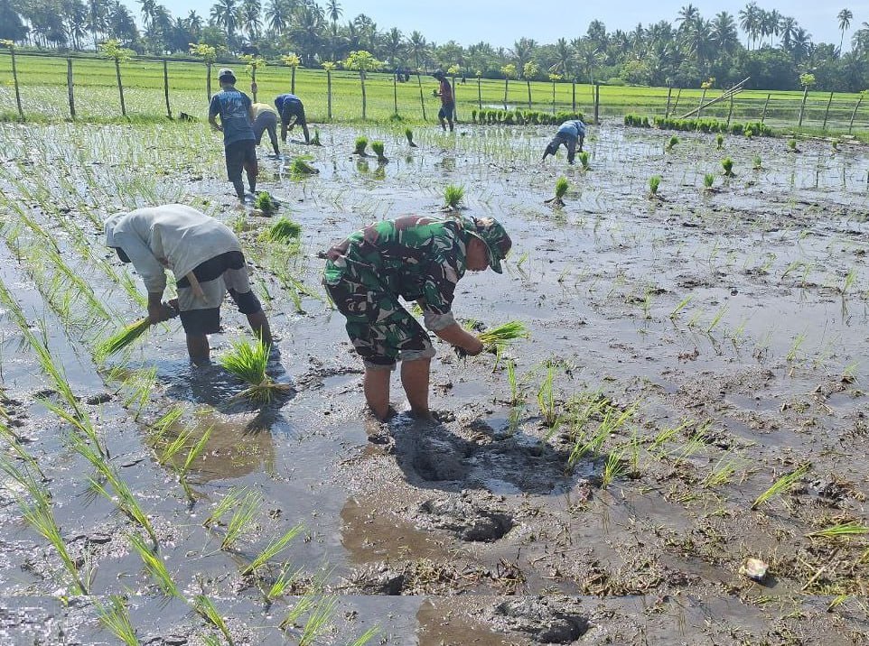 Sinjai – Dalam upaya mendukung program swasembada pangan nasional, Babinsa Desa Pasimarannu Koramil 1424-04/Sinjai Timur, Sertu Mustari, bersama Koordinator Balai Penyuluhan Pertanian (BPP) Kecamatan Sinjai Timur, melaksanakan kegiatan pemantauan dan pendampingan penanaman padi di Dusun Sapoberu, Desa Pasimarannu, Kecamatan Sinjai Timur, Kabupaten Sinjai, Senin (19/05/2025)