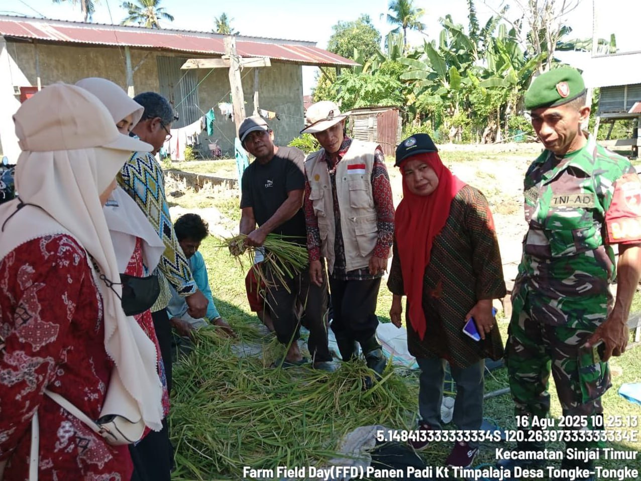 SINJAI. Babinsa Desa Tongke-Tongke Koramil 1424-04/Sinjai Timur, Serka Muhammad Syahrir bersama Koordinator BPP Kec. Sinjai Timur, PPL, dan Ketua Poktan melaksanakan kegiatan pemantauan serta pendampingan panen padi di area Kelompok Tani Timpalaja milik Bapak Muhtar, bertempat di Dusun Bentengnge, Desa Tongke-Tongke, Kecamatan Sinjai Timur.(16/08/2025)