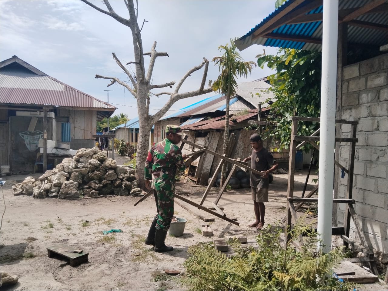 Raja Ampat, PBD– Babinsa Koramil 1805-04/Misol, Kodim 1805/Raja Ampat, Serka Raisel krey Melaksanakan kegiatan Karya Bakti dengan mendampingi sekaligus membantu Warga Desa Binaan Membangun Bangunan Rumah di Kampung Audam, Distrik Misol, Kabupaten Raja Ampat, kamis(26/06/2025).
