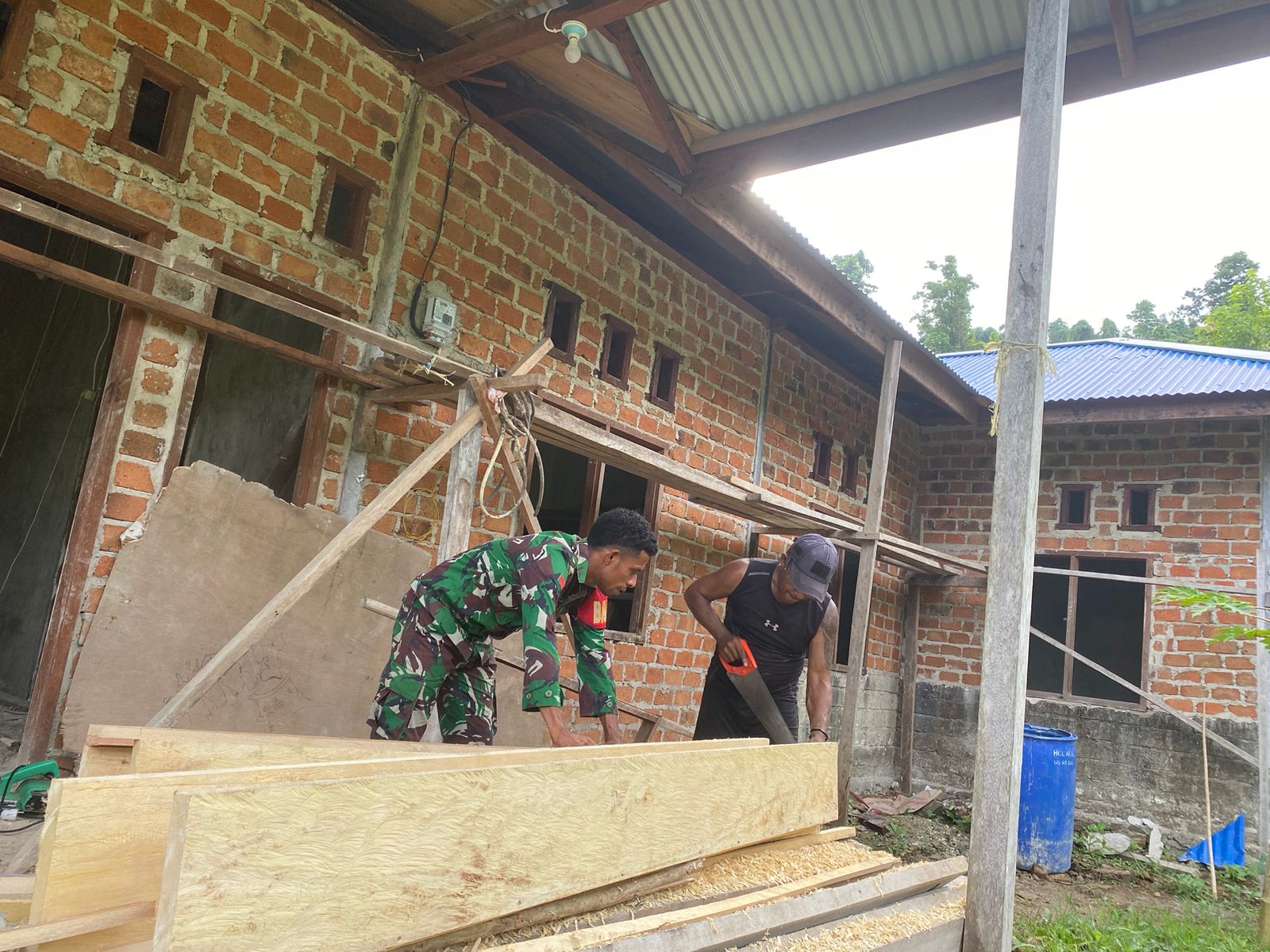 Raja Ampat, PBD- Babinsa Koramil 1805-01/Waisai, Kodim 1805/Raja Ampat, Pratu Steven mambrasar Melaksanakan kegiatan Karya Bakti dengan mendampingi sekaligus membantu Warga Desa Binaan Membangun Bangunan Rumah di Kampung Saugrai, Distrik Mios manswar, Kabupaten Raja Ampat, Selasa (17/06/2025).