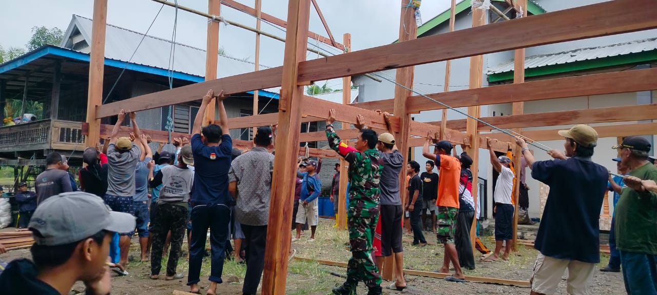 Serka Imran bersama warga saling bahu-membahu dalam mendirikan rumah panggung, yang merupakan salah satu bentuk rumah tradisional di daerah tersebut. Gotong-royong ini tidak hanya mempercepat proses pembangunan, tetapi juga mempererat hubungan sosial antar Babinsa dengan warga.