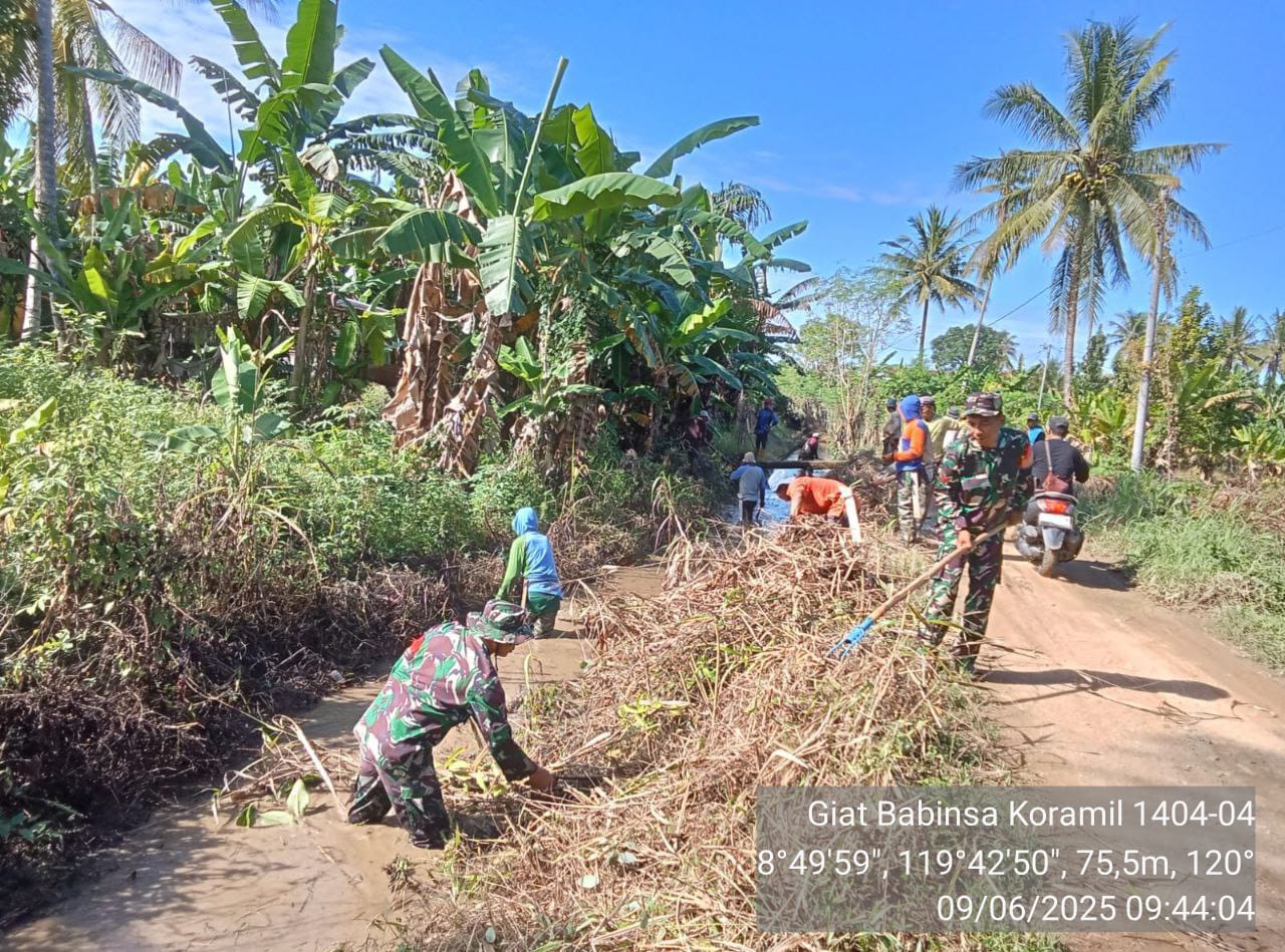 Pinrang_ Untuk memperlancar air mengairi persawahan warga, Babinsa jajaran Koramil-04/Paleteang Kodim 1404/Pinrang melaksanakan kerja bakti pembersihan saluran irigasi bersama warga di Kelurahan Pammase Kecamatan Tiroang Kabupaten Pinrang, Kamis (10/06/2025).