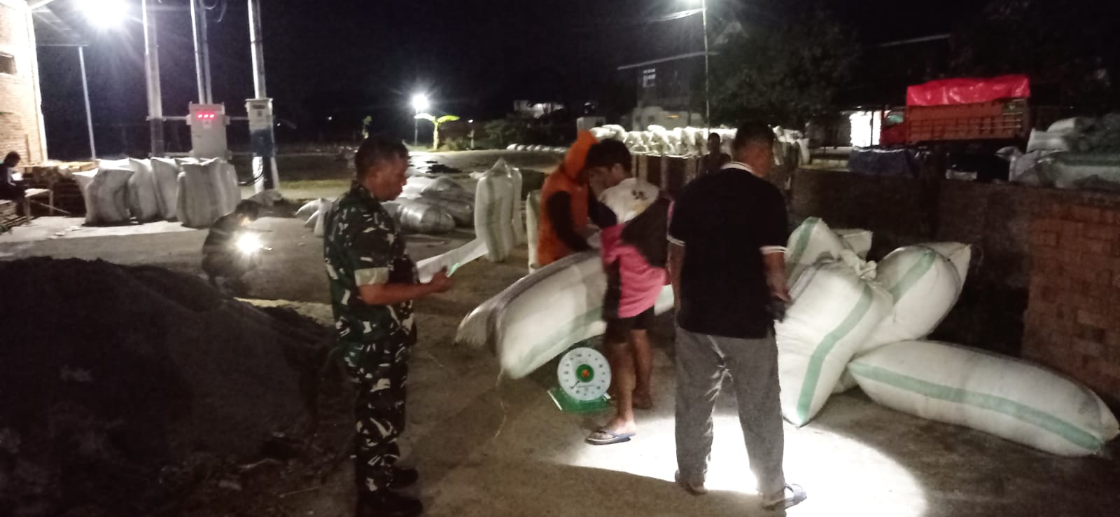 Pinrang_ Meski malam hari dan aktivitas masyarakat umumnya istrahat, semangat Babinsa Koramil-02/Mattiro Sompe Kodim 1404/Pinrang Sertu Satirman tak surut untuk mendampingi kegiatan penyerapan gabah petani di Desa Samaenre Kecamatan Mattiro Somope Kabupaten Pinrang oleh mitra Bulog dengan harga Rp 6.500′-/kilo gram, Rabu (06/05/2025).