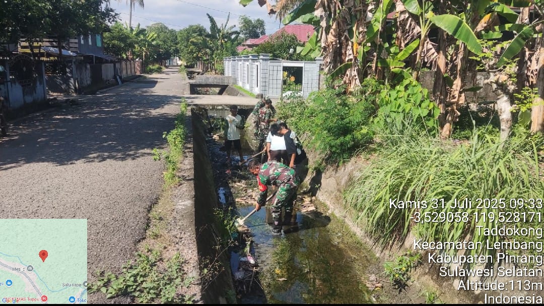 Pinrang_ Untuk meningkatkan ketahanan pangan, Babinsa jajaran Koramil-07/Lembang Kodim 1404/Pinrang melaksanakan kerja bakti bersama warga dengan sasaran membersihkan saluran irigasi di Kampung Tuppu Kelurahan Tadokkong Kecamatan Lembang Kabupaten Pinrang, Kamis (31/07/2025).