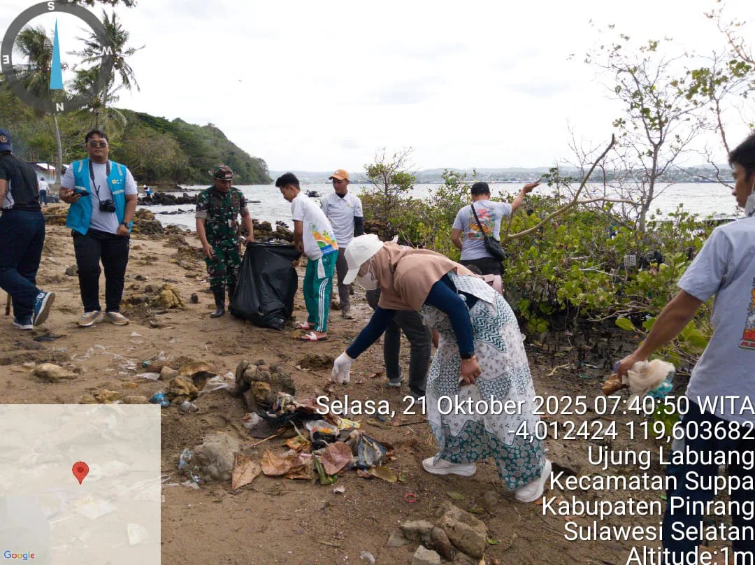 Pinrang_ Babinsa jajaran Koramil 01/Suppa Kodim 1404/Pinrang bersama stakeholder terkait melaksanakan kerja bakti pembersihan pantai yang berlokasi di Dusun Tanamilie, Desa Labuang, Kecamatan Suppa, Kabupaten Pinrang, Selasa (21/10/2025).