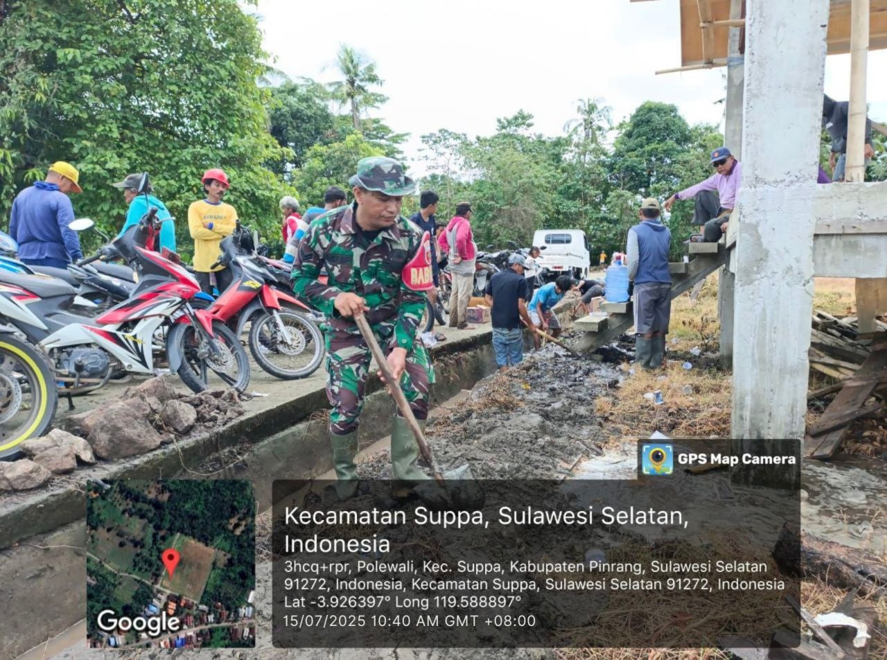 Pinrang_ Dukung Ketahanan pangan, Babinsa Koramil-01/Suppa Kodim 1404/Pinrang Sertu Arief Budi berbaur bersama Staf Desa dan warga melaksanakan kerja bakti pembersihan saluran irigasi di Dusun Belabelawa Desa Polewali Kecamatan Suppa Kabupaten Pinrang, Rabu (16/07/2025).