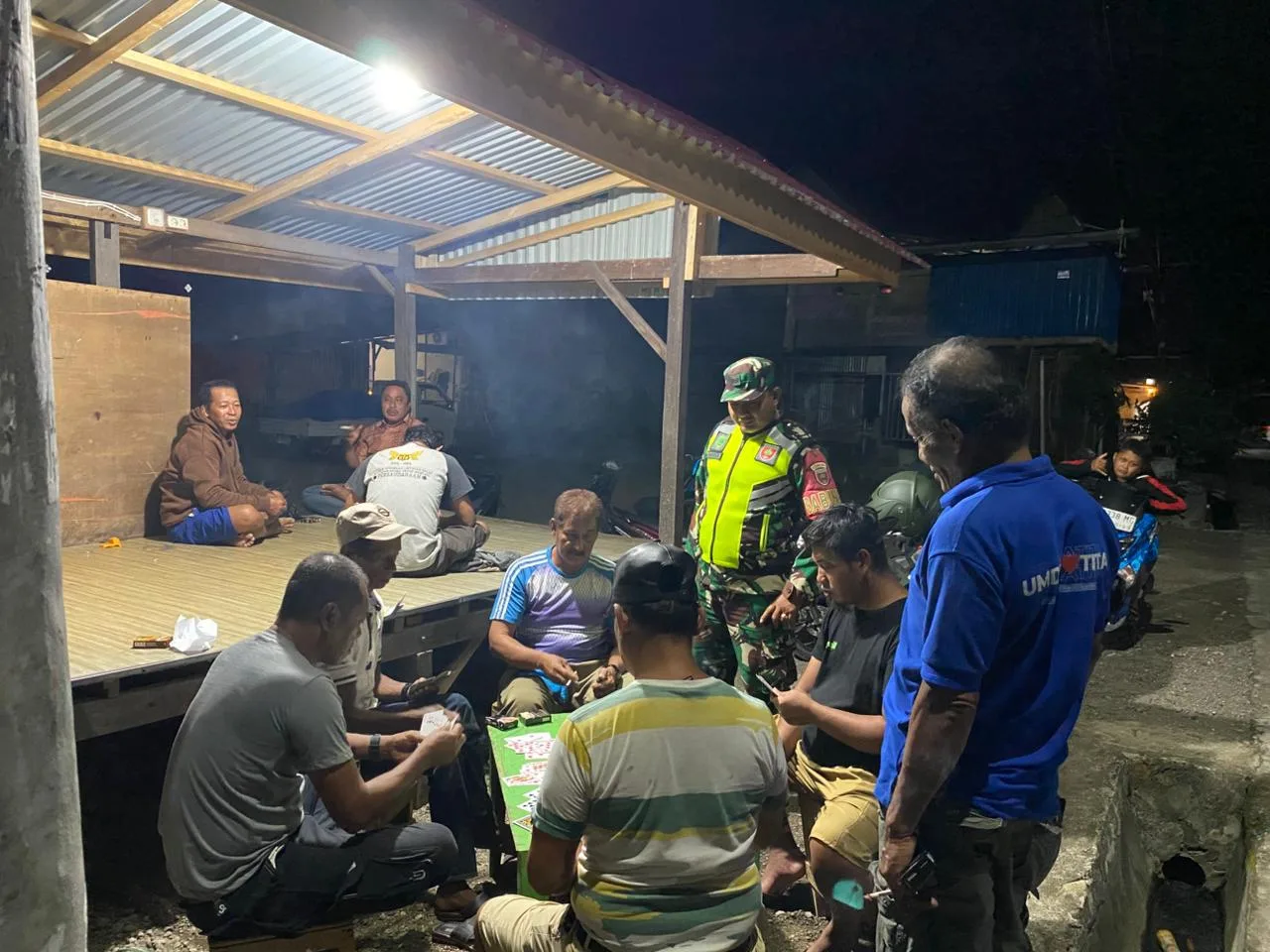 Pinrang_ Babinsa Koramil-03/Mattiro Bulu Kodim 1404/Pinrang Sertu Mansur melaksanakan patroli malam sekaligus komunikasi sosial (komsos) dengan warga yang berjaga di pos keamanan lingkungan Desa Pananrang Kecamatan Mattiro Bulu Kabupaten Pinrang, Minggu (12/10/2025).