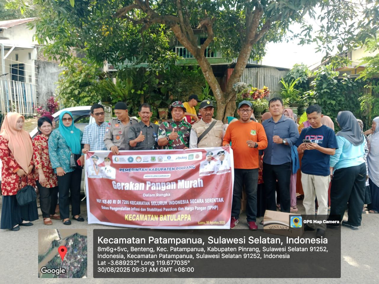 Pinrang_ Babinsa Koramil-05/Patampanua Kodim 1404/Pinrang Serma Muhammad Hatta bersama Bhabinkamtibmas dan Staf Kecamatan melaksanakan pemantauan kegiatan operasi pasar murah di Desa Tapporang Kecamatan Batulappa Kabupaten Pinrang, Sabtu (30/08/2025).