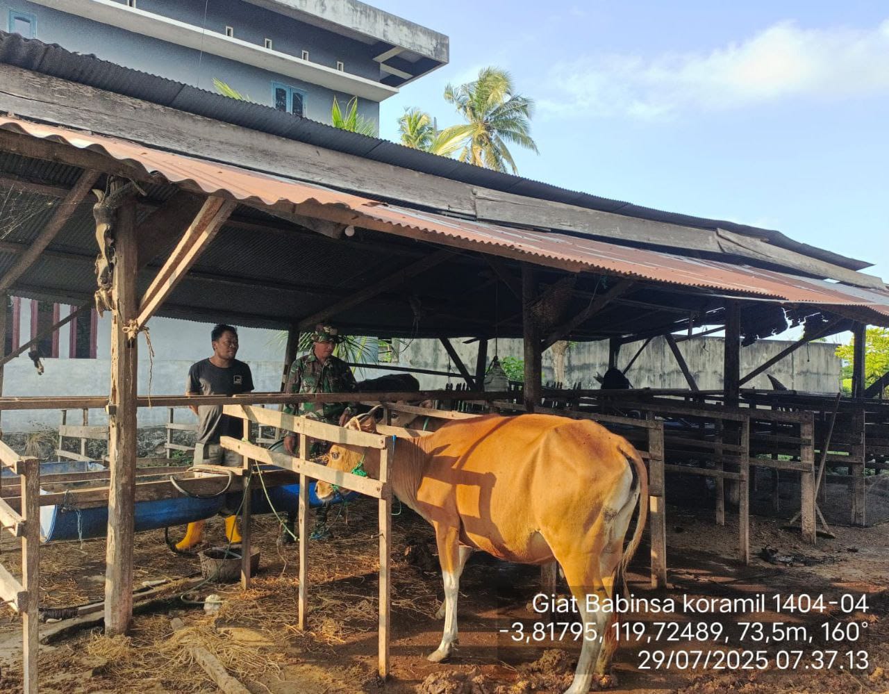Pinrang_ Babinsa Koramil-04/Paleteang Kodim 1404/Pinrang Serka Muh. Yunus secara rutin melaksanakan pemantauan PMK (penyakit mulut dan kuku) kepada hewan ternak sapi milik warga di Kelurahan Marawi Kecamatan Tiroang Kabupaten Pinrang, Rabu (30/07/2025).