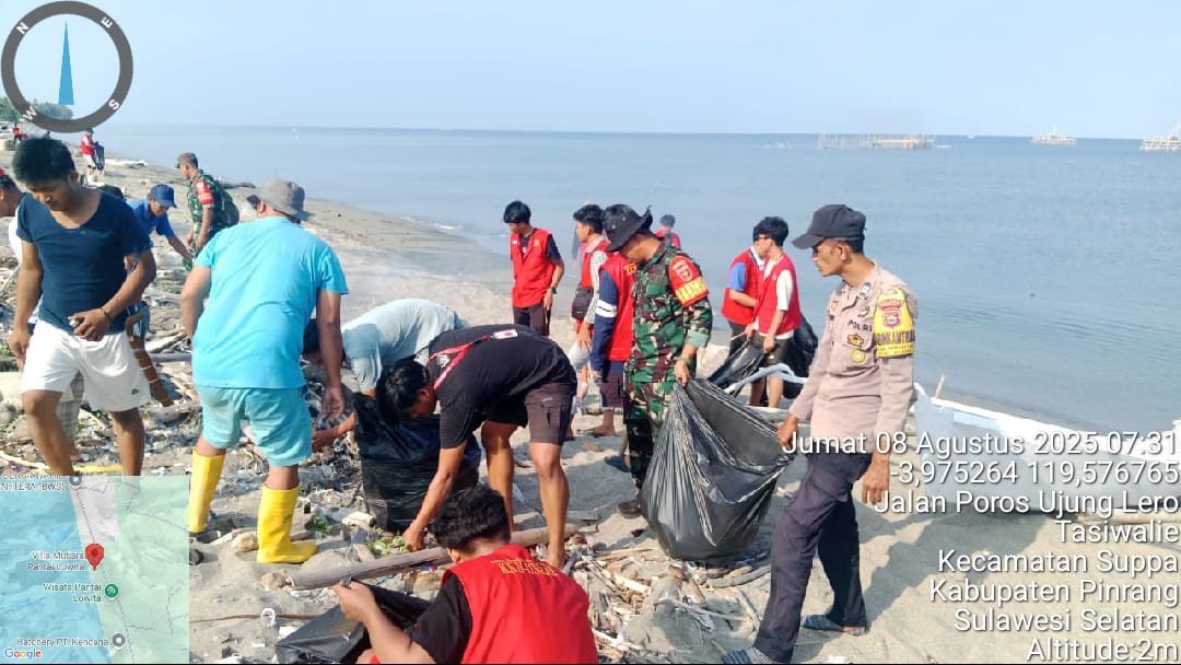 Pinrang_ Peduli kebersihan Lingkungan, Babinsa Koramil-01/Suppa Kodim 1404/Pinrang bersama Forkopimcam dan stake holder terkait lainnya dan warga setempat mengadakan kegiatan kerja bakti pembersihan pesisir Lowita di Desa Tassiwalie Kecamatan SUppa Kabupaten Pinrang, Sabtu (09/08/2025).