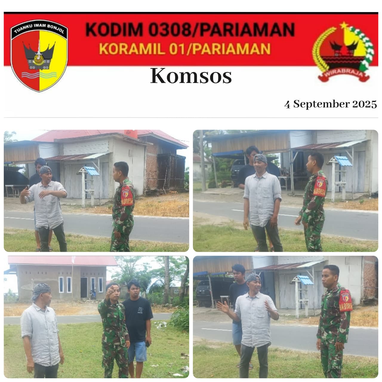 PARIAMAN, – Serda Kastrialdi Babinsa Desa Balai Naras, Koramil 01/Pariaman Kodim 0308/Pariaman melaksanakan kegiatan komunikasi sosial (Komsos) bersama Masyarakat Desa Balai Naras, Kecamatan Pariaman Utara, Kota Pariaman, Kamis, 4 September 2025.
