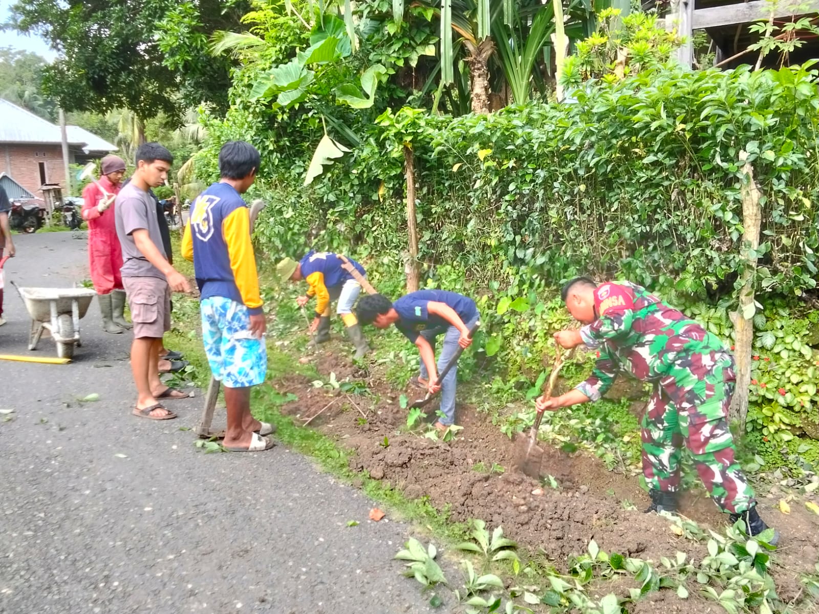 Kodim 1419/Enrekang Praka Helmi Babinsa koramil 02/Enrekang bersama masyarakat melaksanakan karya bakti membersihkan selokan dan tepi jalan sepanjang 150 meter di Lingk. Barani Kel. Tuara Kec. Enrekang Kab. Enrekang, Kamis (10/07/2025).