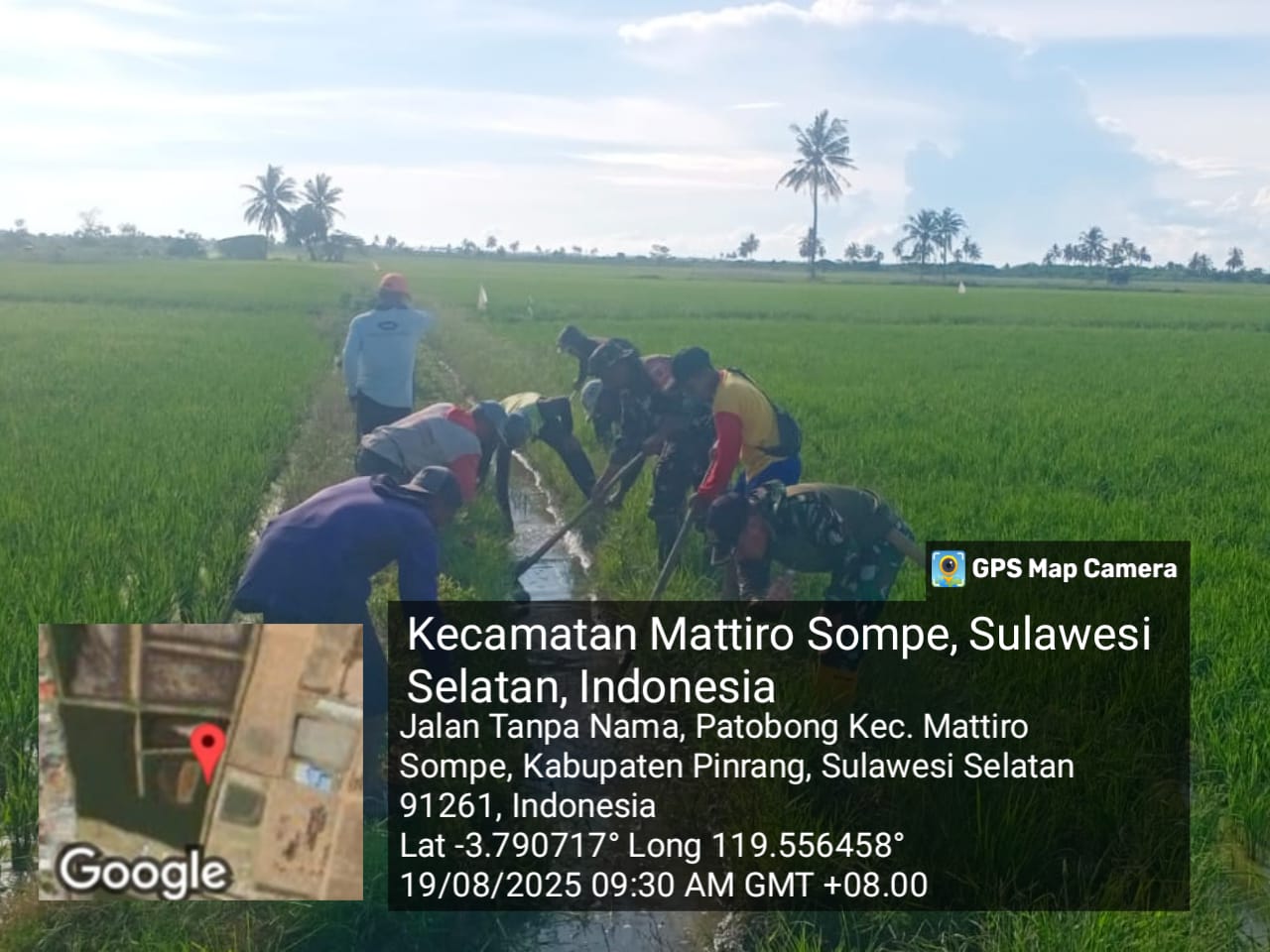 Pinrang_ Untuk memperlancar tahap pengolahan sawah, Babinsa Koramil-02/Mattiro Sompe Kodim 1404/Pinrang Sertu Satirman berbaur bersama warga melaksanakan gotong-royong pembersihan saluran irigasi di Dusun Tanete Desa Patobong Kecamatan Mattiro Sompe Kabupaten Pinrang, Selasa (19/08/2025).