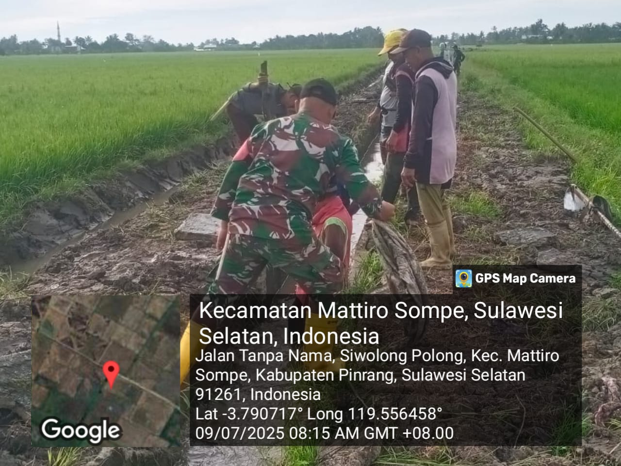 Pinrang_ Babinsa Koramil-02/Mattiro Sompe Kodim 1404/Pinrang Serka Mustaming bersama warga melaksanakan kegiatan kerja bakti membersihkan saluran irigasi di Dusun Kapa Desa Siwolong-polong Kecamatan Mattiro Sompe Kabupaten Pinrang, Rabu (09/07/2025).