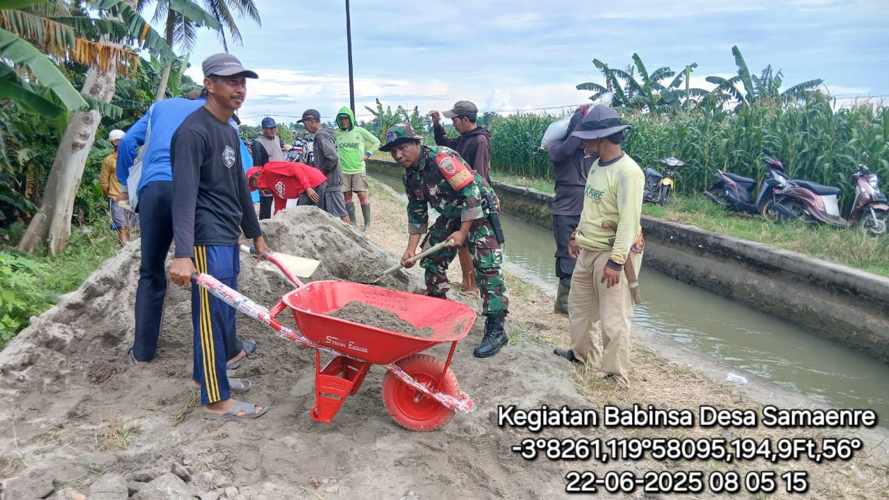 Pinrang_ Dalam upaya membantu para petani dan memperkuat ketahanan pangan di wilayahnya, Babinsa jajaran Koramil-02/Mattiro Sompe Kodim 1404/Pinrang Sertu Satirman melaksanakan kerja bakti bersama warga dengan sasaran perbaiki saluran air yang jebol di Dusun Cappakala Desa Samaenre Kecamatan Mattiro Sompe Kabupaten Pinrang, Senin (23/06/2025).