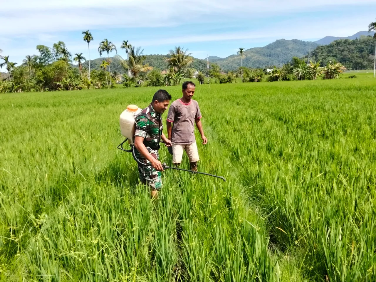 Babinsa Koramil 03/Meukek Dampingi Petani dan Bantu Penyemprotan Hama di Lahan Pertanian