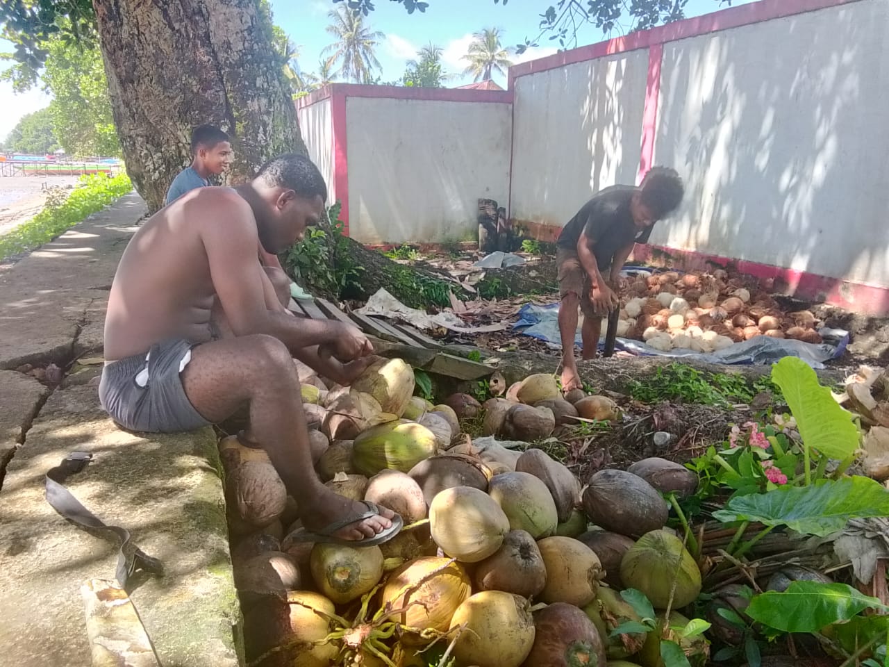 Setelah dibelah buah kelapa akan dipisahkan, dan isi buah kelapa tersebut akan dijadikan sebagai kopra,” Kata Pratu Apner lapon
