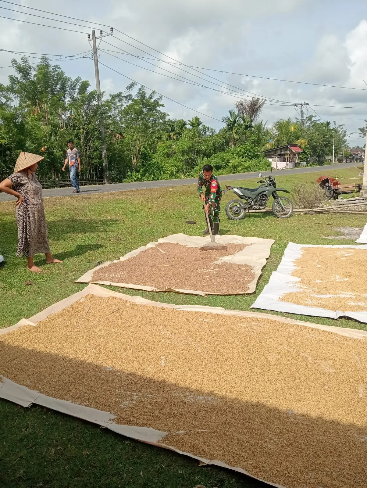 Sertu Joy Dharsa Babinsa Koramil 03/Teupah Selatan, Kodim 0115/Simeulue, Korem 012/Teuku Umar. Melaksanakan komsos membantu warga menjemur padi hasil panen dari sawah mereka sendiri, Kegiatan ini biasanya dilakukan sebelum di bawa ke tempat penggilingan untuk di jadikan beras di Desa Latiung, Kecamatan Teupah Selatan, Kabupaten Simeulue. Minggu (25/01/2026).