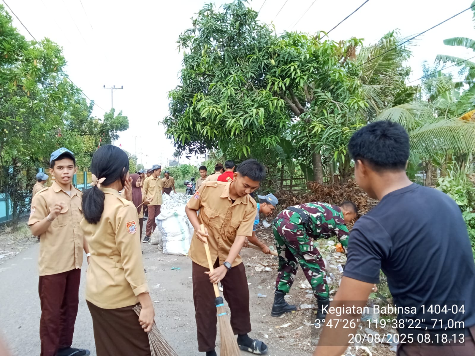 Pinrang_ Peduli kebersihan Lingkungan, Babinsa Koramil-04/Paleteang Kodim 1404/Pinrang Serda Habibi Dalle mengajak anggota Pramuka SMK 2 Pinrang melaksanakan kerja bakti membersihkan sampah-sampah yang berserakan di Jalan Kesehatan Kelurahan Penrang Kecamatan Watang Sawitto Kabupaten Pinrang, Kamis (21/08/2025).