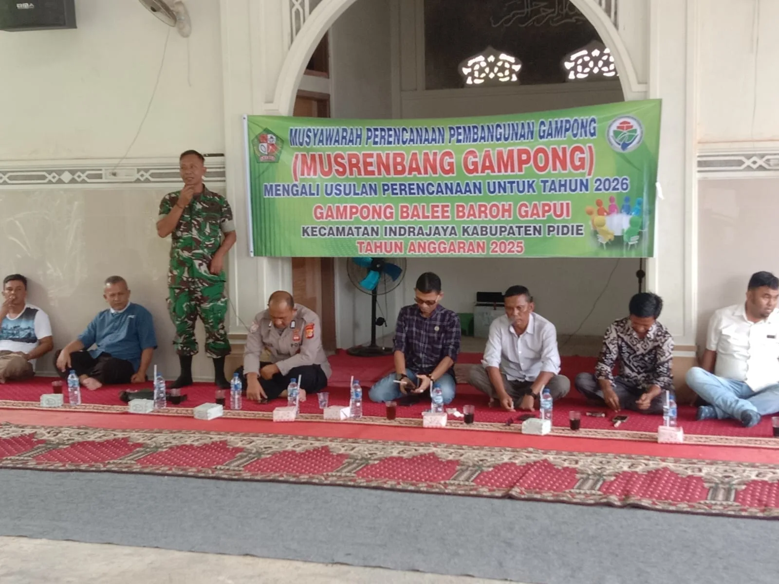 PIDIE – Babinsa Koramil 05/Indra Jaya Kodim 0102/Pidie, Sertu Aceng Apip, menghadiri sekaligus berperan aktif dalam kegiatan Musyawarah Perencanaan Pembangunan (Musrenbang) Tahun Anggaran 2026 tingkat kecamatan yang digelar di Gampong Balee Gapui, Kecamatan Indra Jaya, Kabupaten Pidie, Minggu (28/12/2025).