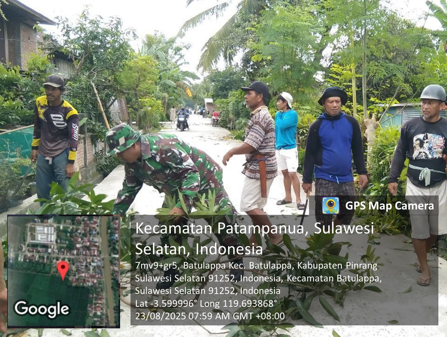 Pinrang_ Kepedulian terhadap lingkungan dan keselamatan warga ditunjukkan oleh Babinsa Koramil-05/Patampanua Kodim 1404/Pinrang Serma Muhammad Hatta saat membantu warga membersihkan ranting pohon yang menutupi jalananan di Desa Batulappa kecamatan Batulappa Kabu[paten Pinrang, Sabtu (23/08/2025).
