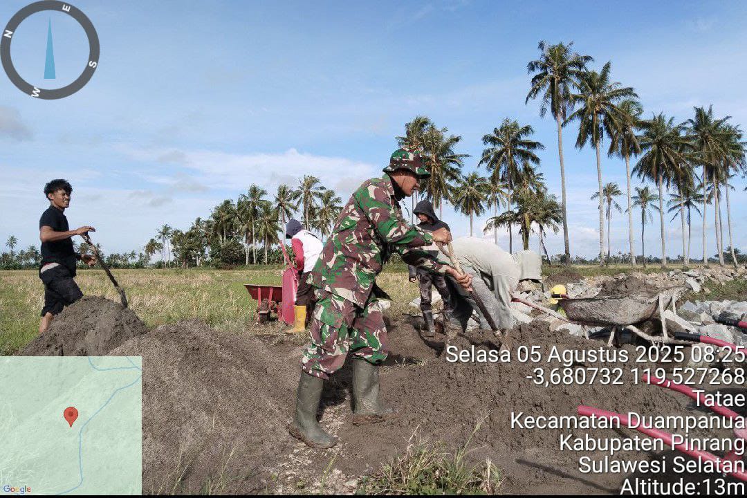 Terkait hal itu untuk memenuhi kebutuhan pengairan di lahan pertanian, Babinsa Koramil-06/Duampanua Kodim 1404/Pinrang Sertu Agus membantu masyarakat dalam pembangunan saluran irigasi di areal persawahan Lingkungan Tansie Kelurahan Tatae Kecamatan Duampanua Kabupaten Pinrang, Selasa (05/08/2025).
