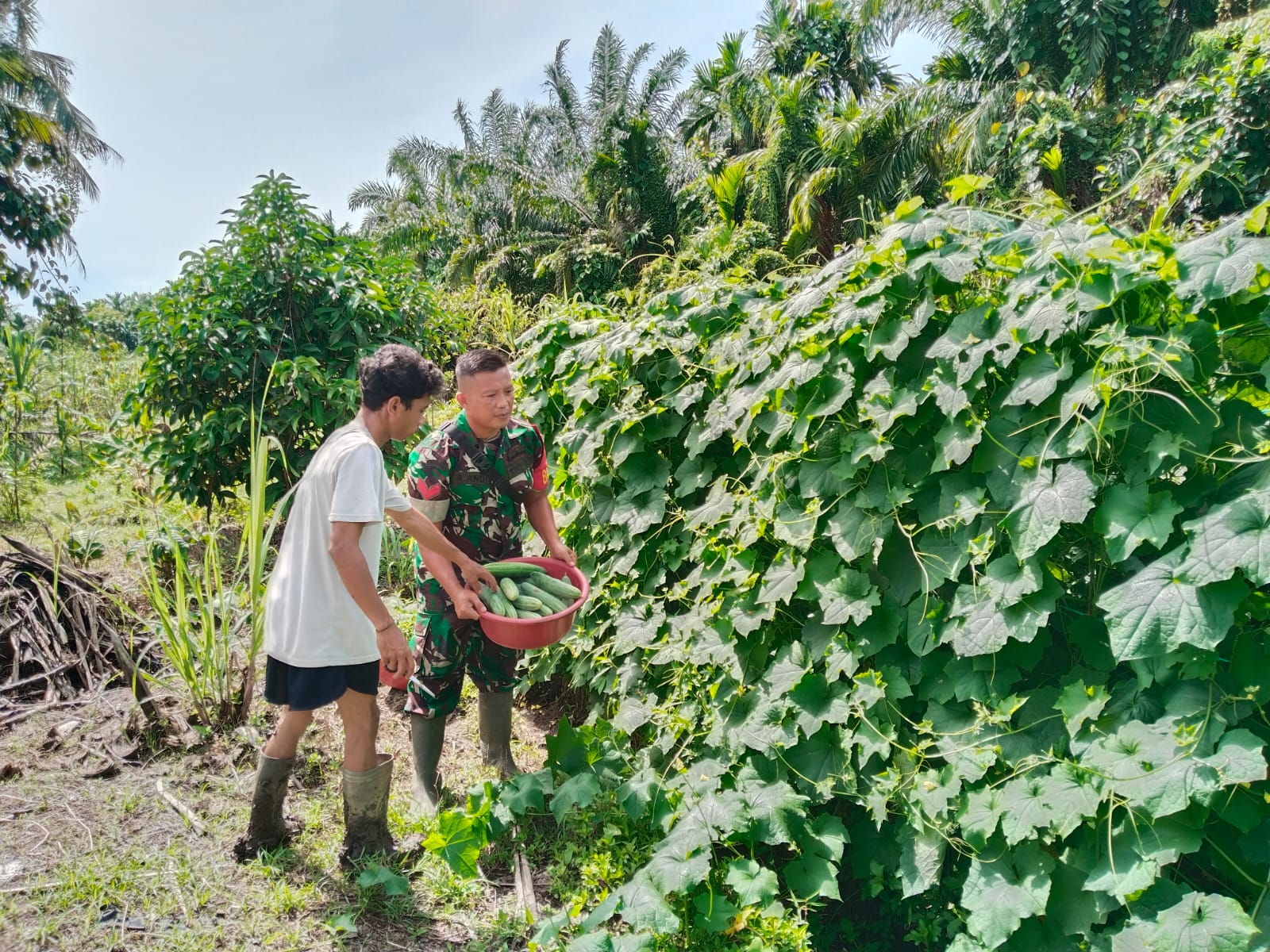 Simeulue – Koptu Apriandi Babinsa Koramil 06/Teluk Dalam, Kodim 0115/Simeulu, Korem 012/Teuku Umar. Mendampingi warga memetik buah mentimun di Desa Bulu Hadek, Kecamatan Teluk Dalam, Kabupaten Simeulue. Jumat (22/08/2025).