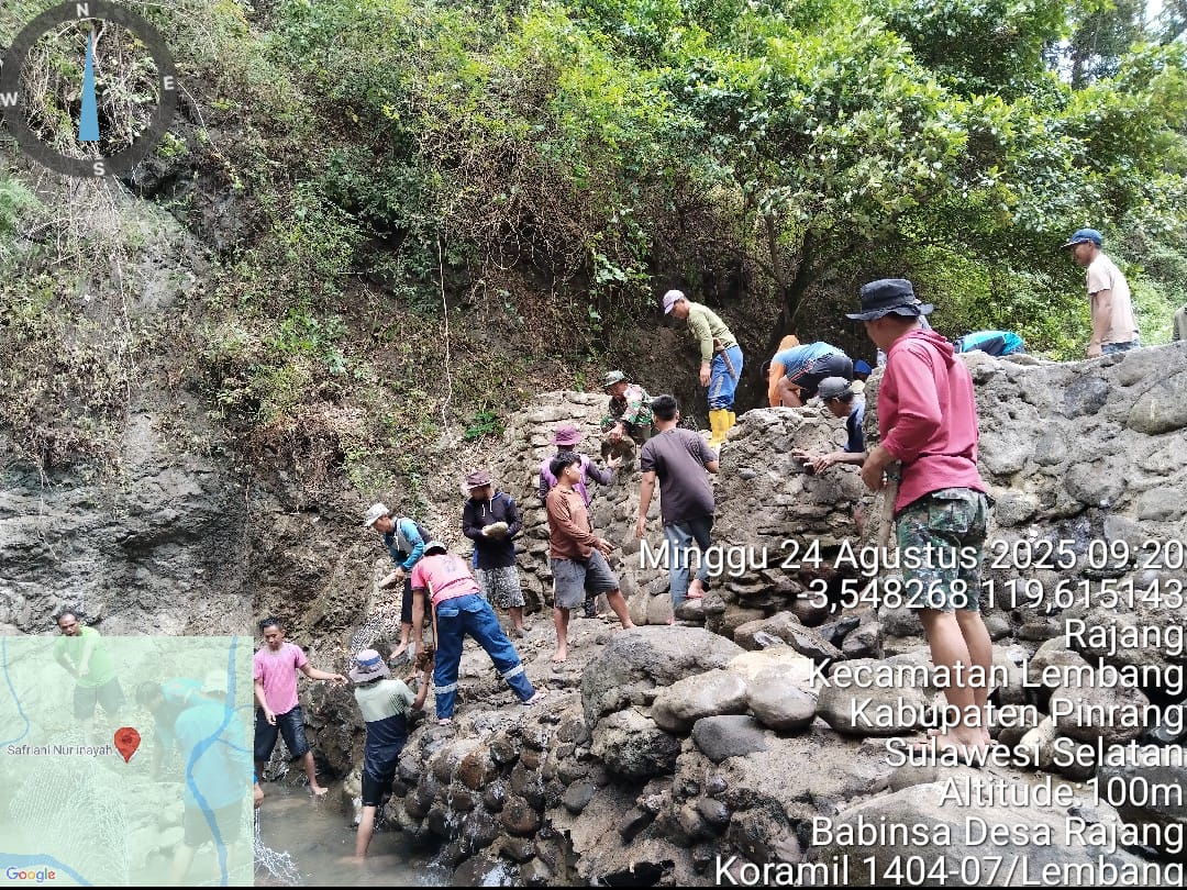 Pinrang_ Babinsa Koramil-07/Lembang Kodim 1404/Pinrang Bersama Warga gotong-royong perbaiki tanggul bendungan yang jebol akibat terdampak banjir saat musim hujan di Desa Rajang Kecamatan Lembang Kabupaten Pinrang, Minggu (24/08/2025).