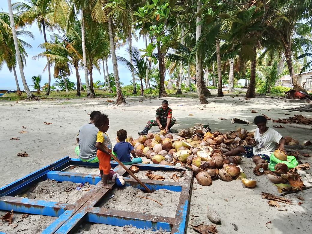 Raja Ampat,PBD- Babinsa Koramil 08/Ayau Kodim 1805/Raja ampat Serka Samsudim membantu membelah buah kelapa milik bapa Yohan Faidan untuk dijadikan kopra di kampung Reni , Distrik Waigeo Utara, Kabupaten Raja Ampat,Kamis (24/04/2025).