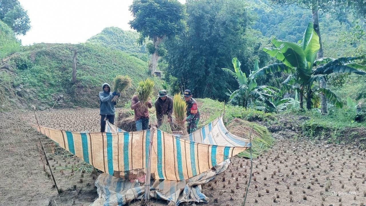 “Walaupun panas terik matahari tidak menyurutkan semangat Bapak Babinsa melakukan pendampingan panen padi kepada kami” ucap Bapak Jemmaing