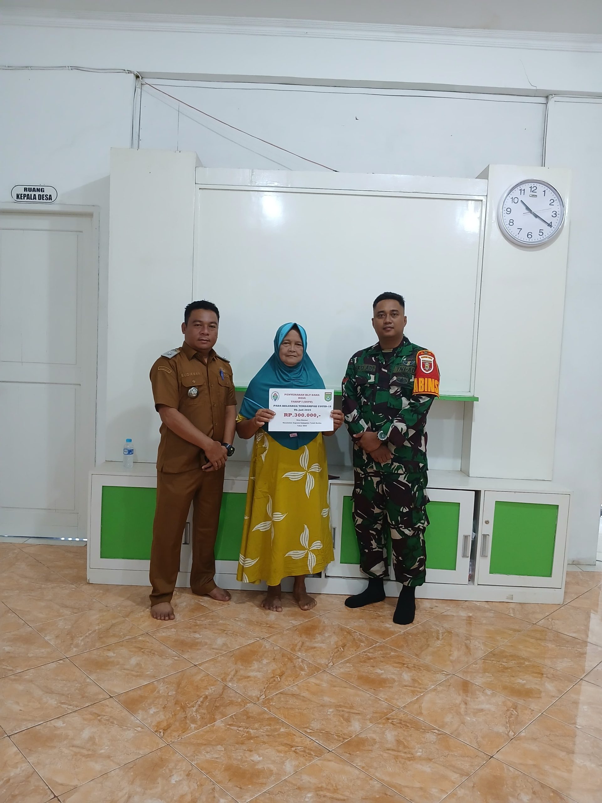 Tanah Bumbu – Babinsa Koramil 1022-07/Angsana dampingi langsung pelaksanaan pembagian Bantuan Langsung Tunai (BLT) kepada 38 orang warga yang berhak mendapatkan bantuan, dengan nominal Rp. 300.000,- per Kepala kelurga, di Kantor Desa Makmur kecamatan Angsana . Kamis (24/07/2025).