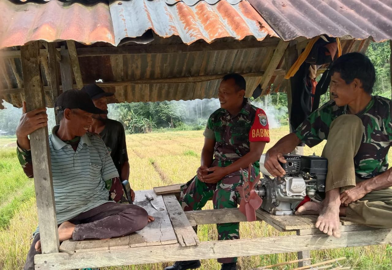 ACEH SELATAN – Dalam upaya mempererat hubungan dengan masyarakat desa binaan sekaligus mendukung program ketahanan pangan, Babinsa Koramil 14/Pasi Raja Serda Sulomo berbincang santai bersama para petani di sebuah pondok sawah di Desa Kruemg Kale Kecamatan Pasi Raja, Minggu (7/9/2025).