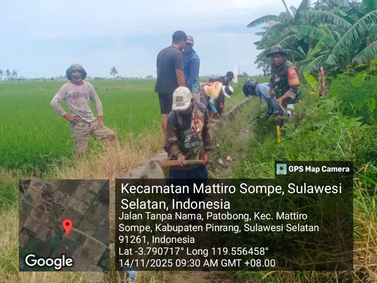 Pinrang_ Babinsa Koramil 1404-02/Mattiro Sompe Kodim 1404/Pinrang melaksanakan kegiatan kerja bakti bersama para petani membersihkan saluran irigasi persawahan sepanjang 1 kilometer yang berlokasi di Dusun Tanete, Desa Patobong, Kecamatan Mattiro Sompe, Kabupaten Pinrang, Jum’at (14/11/2025).
